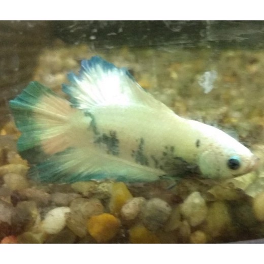 Skumredebygger, hanner kan ikke holdes sammen.Kampfisk, Betta splendens. LEVESTED: SØ-Asien. STØRRELSE: ca. 5-6 cm. AKVARIE STØRRELSE: Artsakvarium fra 4 l. Selskabsalvarium fra. 50 l. TEMPERATUR: 24-30 grader. FODER: Tørfoder, Kampfiskefoder, Dafnier, Myggelarver og Tubifex. OPDRÆT OG ADFÆRD: Kampfisk trives bedst i et lavvandet akvarium på ca. 15 cm. Akvariet skal være veltilplantet, gerne med flydeplanter som hannen kan bygge sin skumrede i. Man må aldrig holde to Kampfiske hanner sammen for så vil de ødelægge hinanden. Det er let at se forskel på kønnene, hannen har store slørfinner, mens hunnen er mindre og har små finner. Det er meget let at opdrætte Kampfisk.