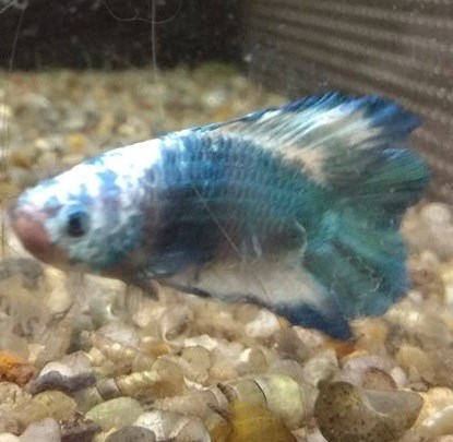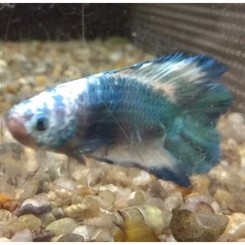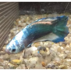Skumredebygger, hanner kan ikke holdes sammen.Kampfisk, Betta splendens. LEVESTED: SØ-Asien. STØRRELSE: ca. 5-6 cm. AKVARIE STØRRELSE: Artsakvarium fra 4 l. Selskabsalvarium fra. 50 l. TEMPERATUR: 24-30 grader. FODER: Tørfoder, Kampfiskefoder, Dafnier, Myggelarver og Tubifex. OPDRÆT OG ADFÆRD: Kampfisk trives bedst i et lavvandet akvarium på ca. 15 cm. Akvariet skal være veltilplantet, gerne med flydeplanter som hannen kan bygge sin skumrede i. Man må aldrig holde to Kampfiske hanner sammen for så vil de ødelægge hinanden. Det er let at se forskel på kønnene, hannen har store slørfinner, mens hunnen er mindre og har små finner. Det er meget let at opdrætte Kampfisk.
