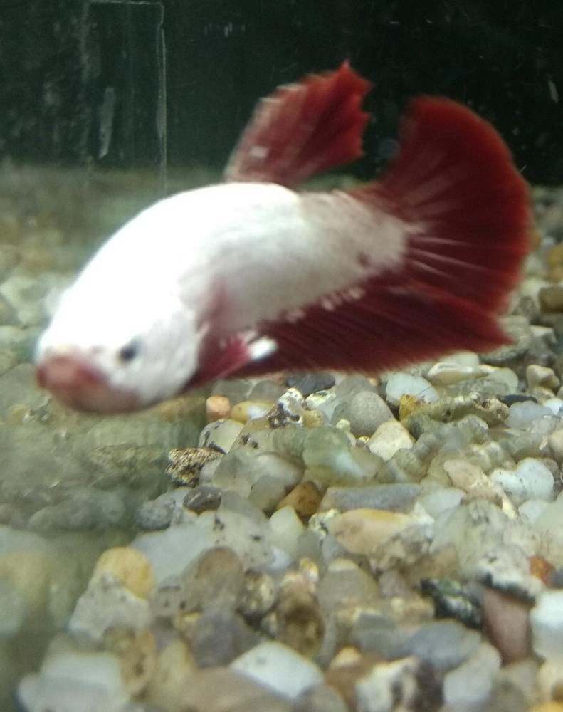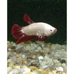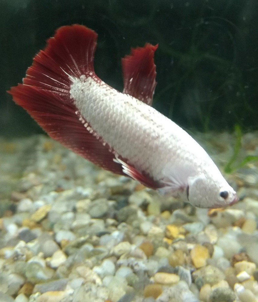 Skumredebygger, hanner kan ikke holdes sammen.Kampfisk, Betta splendens. LEVESTED: SØ-Asien. STØRRELSE: ca. 5-6 cm. AKVARIE STØRRELSE: Artsakvarium fra 4 l. Selskabsalvarium fra. 50 l. TEMPERATUR: 24-30 grader. FODER: Tørfoder, Kampfiskefoder, Dafnier, Myggelarver og Tubifex. OPDRÆT OG ADFÆRD: Kampfisk trives bedst i et lavvandet akvarium på ca. 15 cm. Akvariet skal være veltilplantet, gerne med flydeplanter som hannen kan bygge sin skumrede i. Man må aldrig holde to Kampfiske hanner sammen for så vil de ødelægge hinanden. Det er let at se forskel på kønnene, hannen har store slørfinner, mens hunnen er mindre og har små finner. Det er meget let at opdrætte Kampfisk.