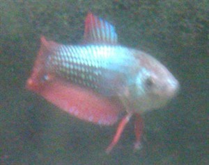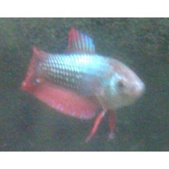 Kampfisk, Betta splendens. LEVESTED: SØ-Asien. STØRRELSE: ca. 5-6 cm. AKVARIE STØRRELSE: Artsakvarium fra 4 l. Selskabsalvarium fra. 50 l. TEMPERATUR: 24-30 grader. FODER: Tørfoder, Kampfiskefoder, Dafnier, Myggelarver og Tubifex. OPDRÆT OG ADFÆRD: Kampfisk trives bedst i et lavvandet akvarium på ca. 15 cm. Akvariet skal være veltilplantet, gerne med flydeplanter som hannen kan bygge sin skumrede i. Man må aldrig holde to Kampfiske hanner sammen for så vil de ødelægge hinanden. Det er let at se forskel på kønnene, hannen har store slørfinner, mens hunnen er mindre og har små finner. Det er meget let at opdrætte Kampfisk. Pasningsvejledning kan ses på www.DYRECENTER.dk Brugernavn: kampfisk Password: 59YA