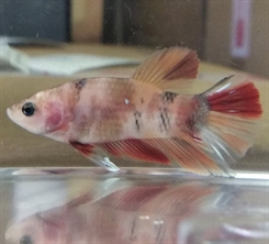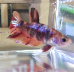 Skumredebygger, hanner kan ikke holdes sammen.Kampfisk, Betta splendens. LEVESTED: SØ-Asien. STØRRELSE: ca. 5-6 cm. AKVARIE STØRRELSE: Artsakvarium fra 4 l. Selskabsalvarium fra. 50 l. TEMPERATUR: 24-30 grader. FODER: Tørfoder, Kampfiskefoder, Dafnier, Myggelarver og Tubifex. OPDRÆT OG ADFÆRD: Kampfisk trives bedst i et lavvandet akvarium på ca. 15 cm. Akvariet skal være veltilplantet, gerne med flydeplanter som hannen kan bygge sin skumrede i. Man må aldrig holde to Kampfiske hanner sammen for så vil de ødelægge hinanden. Det er let at se forskel på kønnene, hannen har store slørfinner, mens hunnen er mindre og har små finner. Det er meget let at opdrætte Kampfisk.