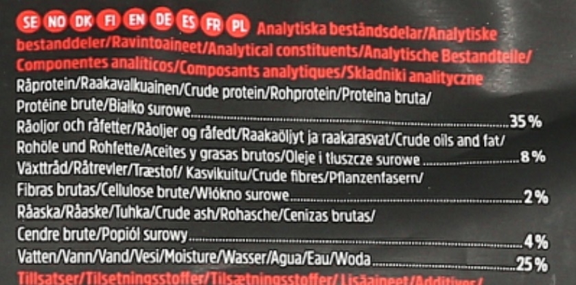 Råprotein 35% Råolier og -fedt 8% Kostfibre 2% Råaske 4% Vand 25% Energi: 365 kcal/100 g.