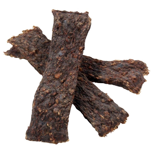 Lækre kødstrips af 100% krondyr, mellembløde plader som nemt kan brækkes i mindre stykker evt til træning.