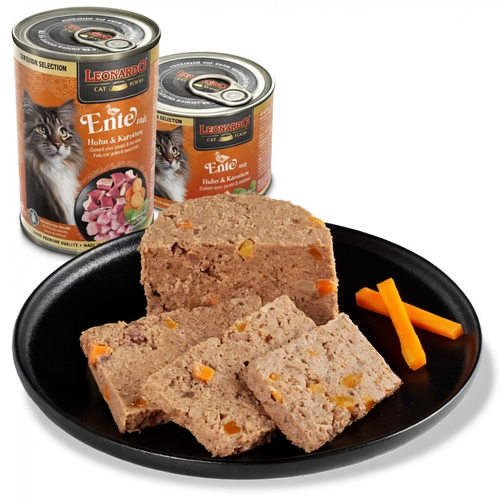 Saftigt og smagfuldt vådfoder med and, kylling og indmad. Karotten og Lachsöl er med til en god næring og fremmer en skinnende pels, mens katteurt giver det et ekstra lille gourmet-touch.