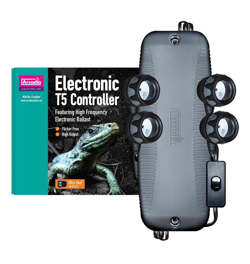 En lampe, der fastgøres til enderne af et T5-rør. Lampen kan fastgøres til loftet i terrariet, fx ved at skrue eller med jerntråd. Holderne har huller til dette.