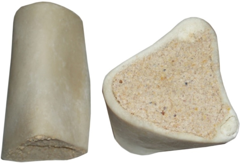 Store marvben fyldt med kylling, noget hunden elsker at bruge tid på.
