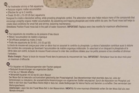 Den realistiske mosbold optager fosfater og andre giftstoffer, der kan give problemer fra vandet. Den er perfekt i rejeakvarier og i mindre akvarier.
