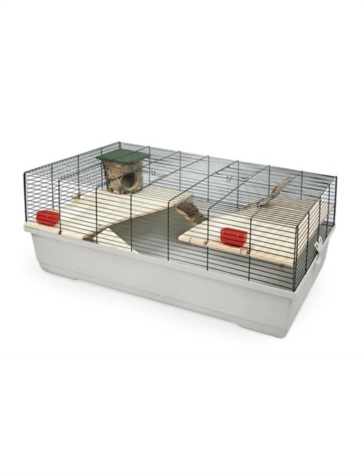 Nature hamsterbur fra firmaet MPS. Stort hamsterbur med tremmer i metal og bund i plast,  som er velegnet til f.eks. guldhamstere. Med platforme, hus og stiger i træ. Madskåle i plast.