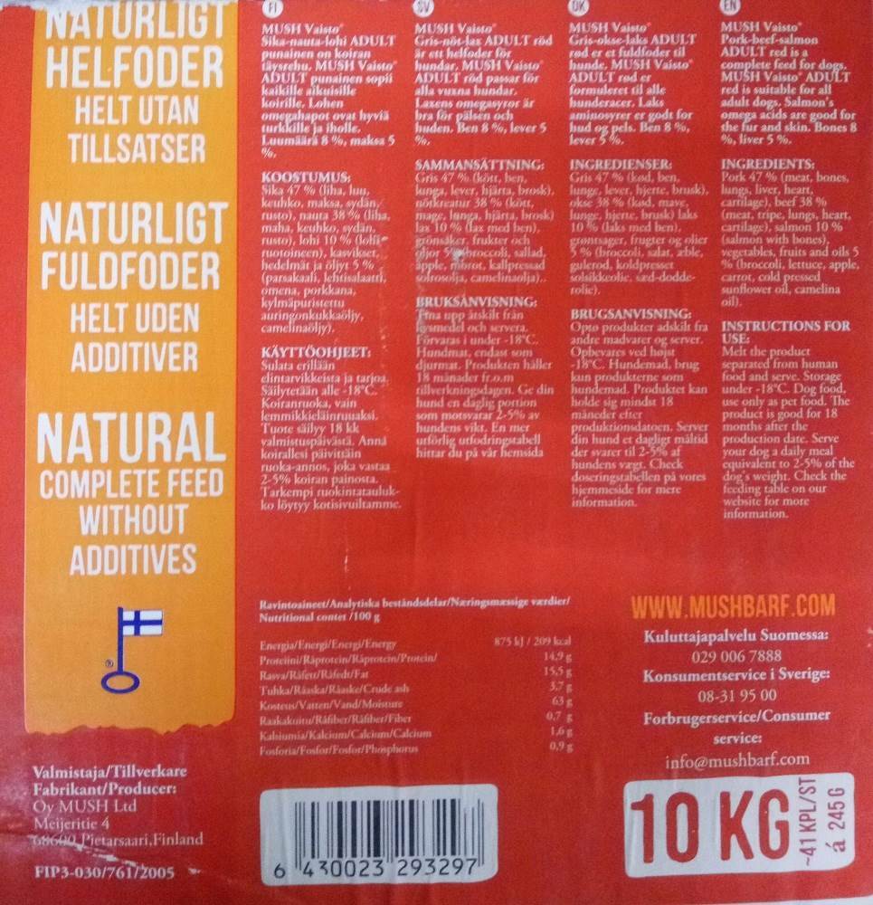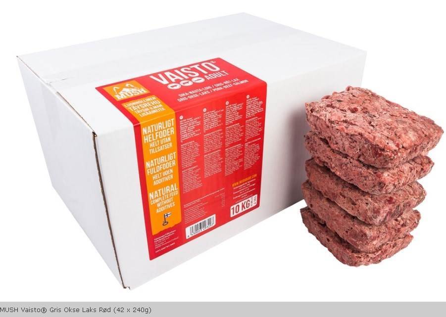 10kg kasse med 41stk 245g potioner gris okse laks fra MUSH