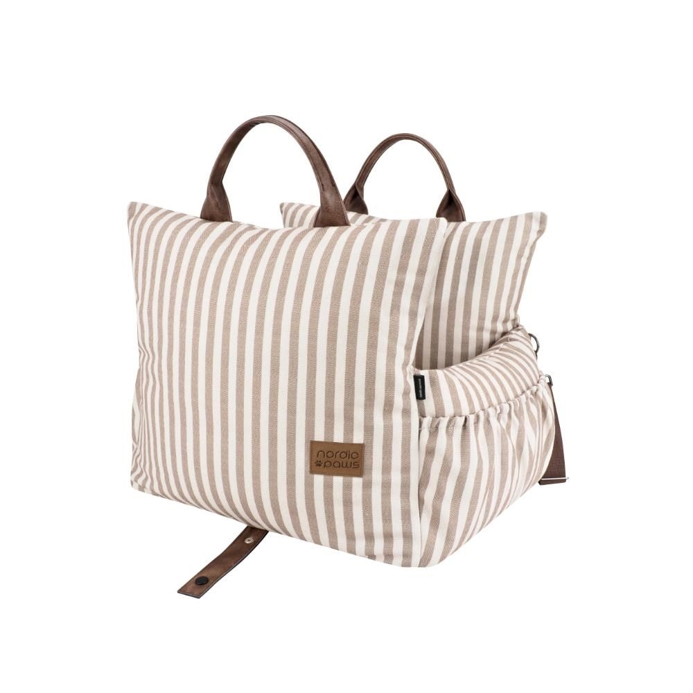 Bailey bilsæde af mærket Nordic Paws. Elegant og praktisk bilsæde i elegant stribet look. Hovedsageligt fremstillet i genbrugsmateriale. Den ene side kan foldes ned, så hunden får et godt udsyn på turen. Med håndtag, så bilsædet også kan anvendes som taske. Praktisk lomme til f.eks. godbidder eller høm-høm. Justerbar strop til fastgørelse på bilens sæde. Med anti-anti-slipbund.