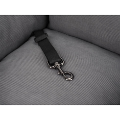 Bemærk: Stroppen til at sætte hunden fast i, er kun for hunden bliver på sædet. Stroppen sikrer IKKE hunden ved uheld. Her skal anvendes en dertil godkendt sele og strop. Snoren monteres i selen og ikke i halsbåndet, da hunden herved kan blive kvalt ved biluheld.