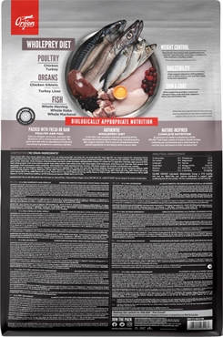Fersk kylling (20 %), fersk kyllingeindmad (lever, hjerte) (11 %), rå hel sild (8 %), rå kalkun (6 %), rå hel kulmule (5 %), friske æg (5 %), rå hel makrel (4 %), dehydreret kylling (4 %), dehydreret kalkun (4 %), dehydreret makrel (4 %), dehydreret sardin (3 %), dehydreret sild (3 %), dehydreret hvidfisk (3 %), rå kalkunlever (3 %), linsefibre, hele røde linser, hele grønne linser, hele ærter, hele kikærter, hele pinto-bønner, ærtestivelse, hele marinebønner, dehydreret blåhvilling (1 %), kyllingefedt (1 %), æblefibre, tørret tang, alger (kilde til DHA), friske hele græskar, friske hele butternutsquash, friske hele courgetter, friske hele gulerødder, friske hele æbler, friske hele pærer, tørret cikorierod, frisk grønkål, frisk spinat, friske rødbeder, friske majroer, hele tranebær, hele blåbær, hele saskatoonbær, gurkemeje, marietidsel, burrerod, lavendel, althearod, hyben.