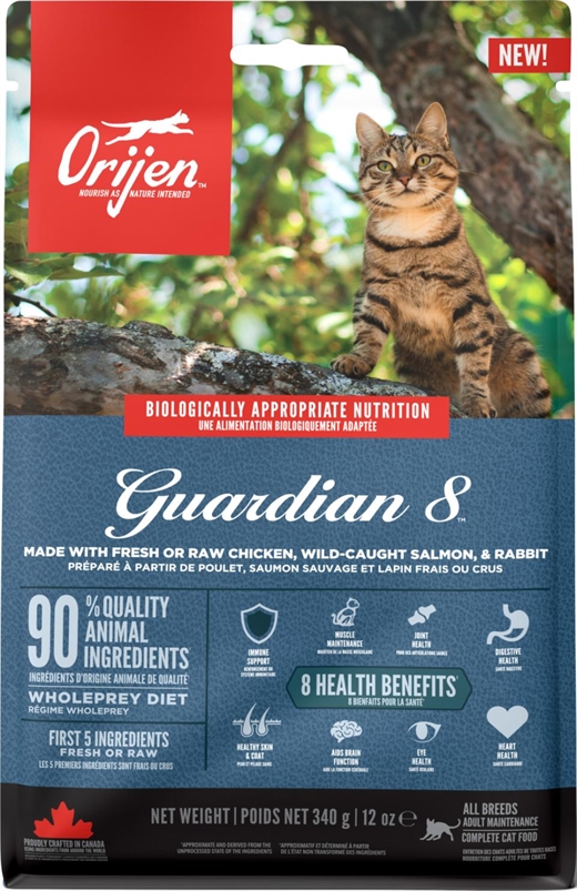 ORIJEN Guardian 8 henvender sig til den sundhedsbevidste forbruger, der er på udkig efter en kost, der vil støtte deres kat gennem hele livet. Med 90% animalske kvalitetsingredienser, hvoraf 2/3 er ferske eller rå, understøtter Guardian 8 din kats immun- og fordøjelsessystem, giver sund hud og pels, opretholder muskel-, led- og hjertesundhed, understøtter hjernens og den kognitive funktion samt øjnenes sundhed. Guardian 8 indeholder kun næringsrige ingredienser, der hjælper med at støtte din kat.