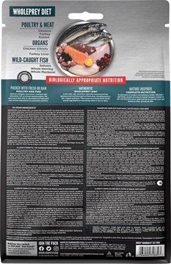 Fersk kylling (32%), rå laks (5%), rå kalkun (5%), rå hel sild (5%), rå hel makrel (5%), fersk kyllingeindvolde (lever, hjerte) (4.5 %), rå kalkunlever (4 %), friske æg (4 %), dehydreret kylling (4 %), dehydreret kalkun (4 %), dehydreret sild (4 %), dehydreret kyllingelever (4 %), dehydreret æg (4 %), rå kanin (4 %), hele røde linser, hele pintobønner, hele grønne linser, hele kikærter, hele marinebønner, hele ærter, ærtestivelse, malet miscanthusgræs, sejolie (1%), kyllingefedt (0.5%), friske hele græskar, friske hele butternutsquash, tørret tang, tørret cikorierod, friske hele æbler, friske hele gulerødder, friske hele pærer, friske hele zucchini, ølgær, hydrolyseret gær, friske rødbeder, frisk grønkål, frisk spinat, friske majroer, hele tranebær, hele blåbær, hele saskatoonbær, burrerod, lavendel, althearod, marietidsel, hyben, gurkemeje.