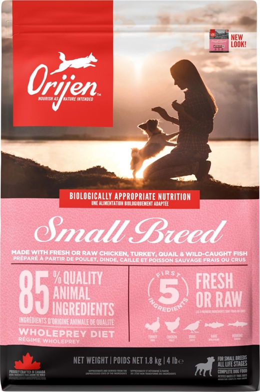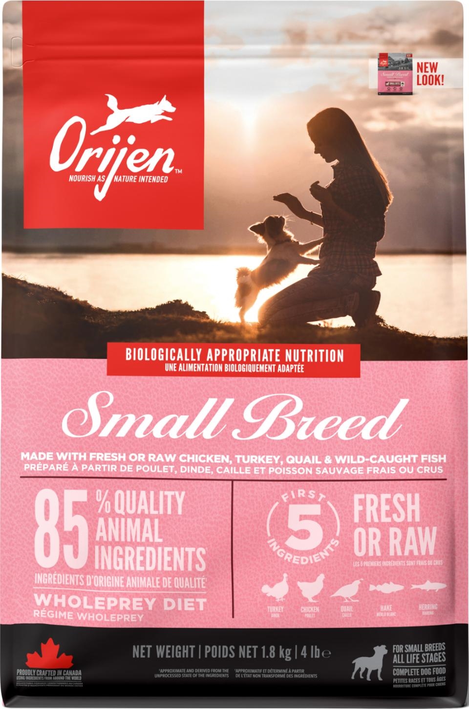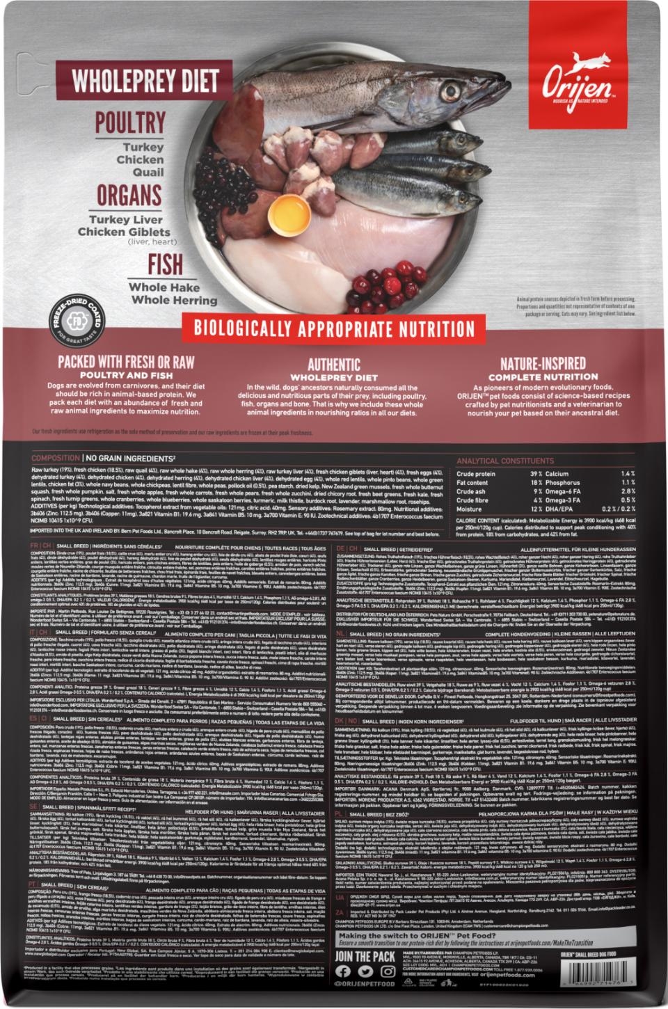 Rå kalkun (19%), fersk kylling (18.5%), rå vagtel (4%), rå hel kulmule (4%), rå hel sild (4%), rå kalkunlever (4%), fersk kyllingeindvolde (lever, hjerte) (4%), friske æg (4%), dehydreret kalkun (4%), dehydreret kylling (4%), dehydreret sild (4%), dehydreret kyllingelever (4 %), dehydreret æg (4 %), hele røde linser, hele pintobønner, hele grønne linser, kyllingefedt (3 %), hele marinebønner, hele kikærter, linsefibre, hele ærter, sejolie (0,5 %), ærtestivelse, kikærteolie (0,5 %), tørret tang, New Zealandske grønne muslinger, friske hele butternutsquash, friske hele græskar, salt, friske hele æbler, friske hele gulerødder, friske hele pærer, friske hele zucchini, tørret cikorierod, friske rødbeder, frisk grønkål, frisk spinat, friske majroer, hele tranebær, hele blåbær, hele saskatoonbær, gurkemeje, marietidsel, burrerod, lavendel, althearod, hybenroser.