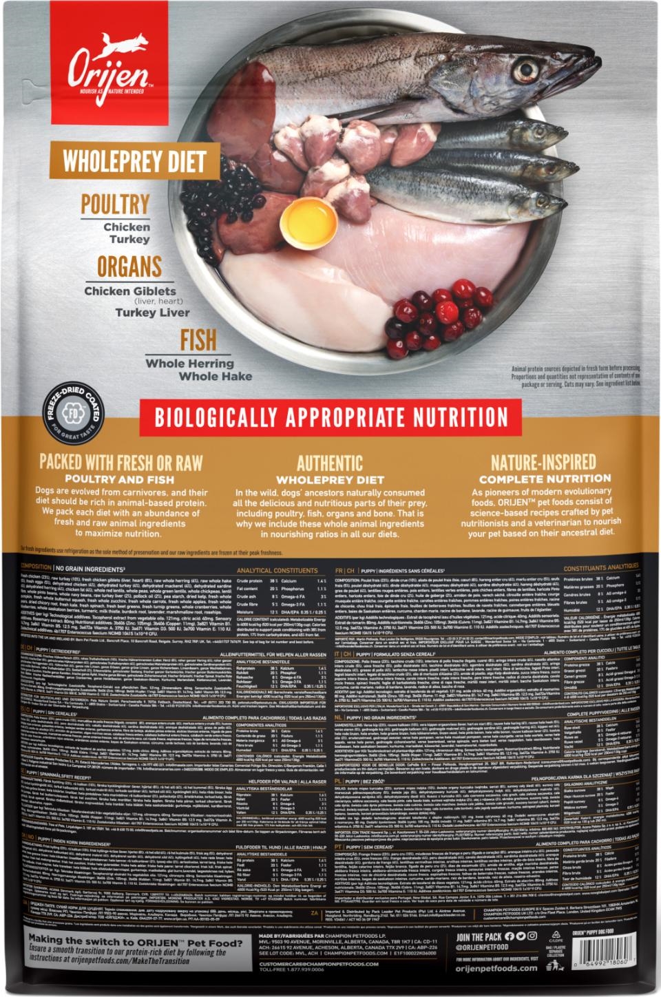 ORIJEN™ Puppy Food er formuleret til at opfylde de ernæringsmæssige niveauer, der er fastsat af FEDIAF for alle livsstadier, bortset fra vækst hos grand danois-hvalpe før 14 uger.
