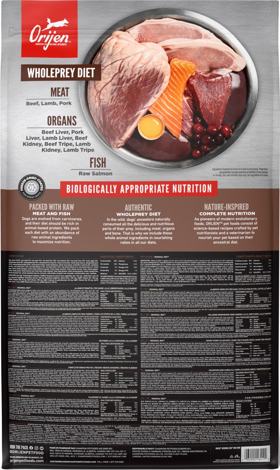 Hjælp din hund med at trives med proteinrige opskrifter, der giver maksimal næring. Hunde er nedarvede kødædere, så de har brug for en Biologically Appropriate™ kost, der er rig og varieret på hele animalske ingredienser. ORIJEN Regional Red™ foder er fyldt med 85% animalske kvalitetsingredienser som råt oksekød, vildsvin, bison, lam og svinekød. Fyldt med WholePrey animalske ingredienser som organer og brusk, er ORIJEN™ foderet lavet med de næringsrige, saftige dele af byttet for at levere den næring, som hunde har brug for. Resultatet er en kost til din hund, der er uden sammenligning.