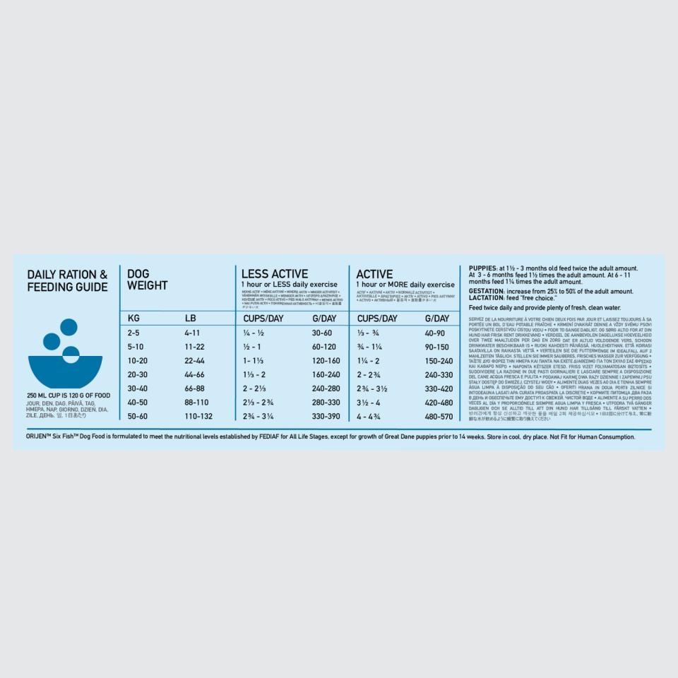 ORIJEN™ Six Fish™ Hundefoder er sammensat for at opfylde de ernæringsmæssige niveauer, der er fastsat af FEDIAF for alle livsstadier, bortset fra vækst hos grand danois-hvalpe før 14 uger.