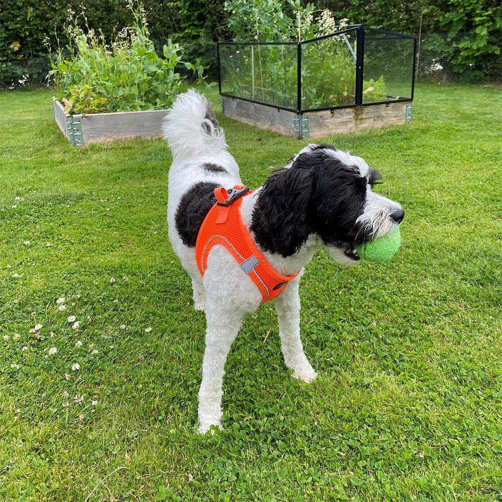 En blød og luftig sele til hunde. Det polstrede design reducerer belastningen på din hund. Selen har reflekterende linjer hele vejen rundt for at holde din firbenede ven sikker i mørket. Snoren er fastgjort til dobbelt-d krogen på bagsiden.