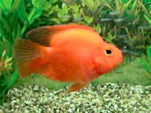 Papegøjen cichlide blev udviklet i Taiwan og de første eksemplarer af den første form for papegøje cichlider, blodet papegøje cichlide, blev introduceret på markedet i 1986. Derefter tog noget tid, før disse fisk blev kendt i Vesten. Udtrykket papegøje cichlide kan også henvise til Hoplarchus Psittacus. Den nøjagtige oprindelse bag denne hybrid er ukendt. Det er imidlertid et resultat af krydsning mellem forskellige sydamerikanske cichlider. Den mest accepterede teori er, at Blodet papegøje cichlide er resultatet af krydsningen en mandlig "Cichlasoma citrinellum" (midascichliden) og en kvinde "Cichliasoma synspilum" (redhead cichlide). Der er dog også en række teorier, der mener, at papegøje cichlider indeholder gener fra en slags Severum cichlide. Der findes flere forskellige typer af papegøje cichlider tilgængelige i handelen. Det skal dog bemærkes, at bubblegum papegøje cichlider og Jellybean papegøje cichlider er ikke rigtig papegøje cichlider, men snarere en hybrid mellem en papegøje cichlider og zebracichlider. Et akvarium er beregnet til blod papegøje cichlider skal være dekoreret med en blød bund substrat. Brug trærødder og sten til at skabe skjulesteder for fiskene, da de ellers kan være ganske genert. De har brug for et stort akvarium på grund af deres størrelse, kan en papegøje cichlide vokse til at være 25cm / 10 inches. De bør ikke holdes i akvarier mindre end 200L / 50 gallon. Blood papegøje cichlide kræver god filtrering, da de kan sætte et stort pres på vandkvaliteten. Store ugentlige vandskift er også påkrævet. En pH-værdi på 6,5-7,5 er at foretrække. De egner selskab for en lang række arter såsom Danios, Barbs, Cory katte, sølv dollars og andre sydamerikanske cichlider. Må ikke holde dem med zebracichlider, da der er stor risiko for krydsning.