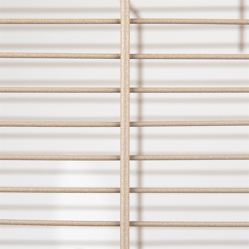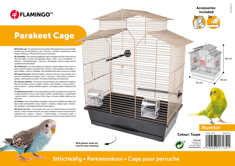 Giv din undulat et hyggeligt hjem med dette rummelige bur i metallisk taupe. Komplet med siddepinde, mad- og vandskåle og praktiske svingdøre for nem adgang. Nem at rengøre takket være den udtrækkelige bakke.