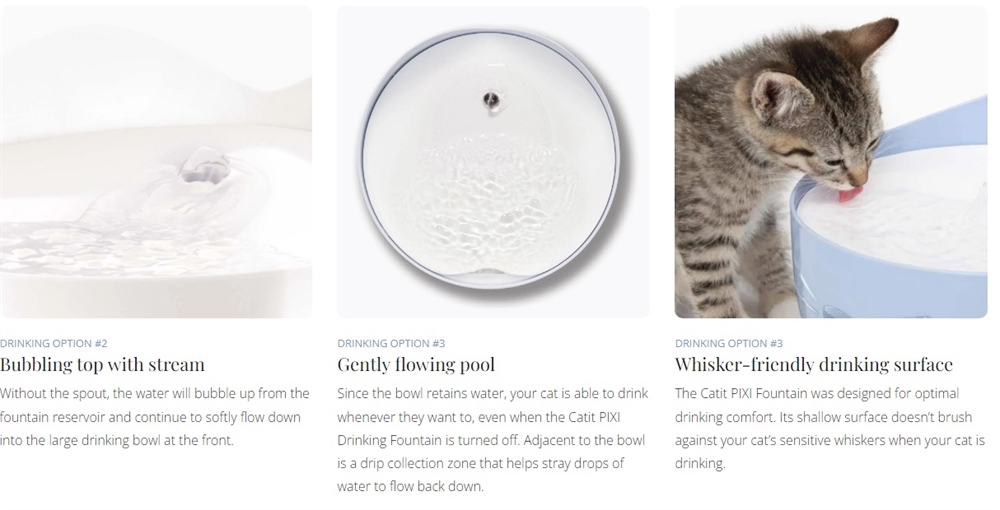 •3 forskellige drikkemuligheder for katten: stille, kraftigere og boblende vand.