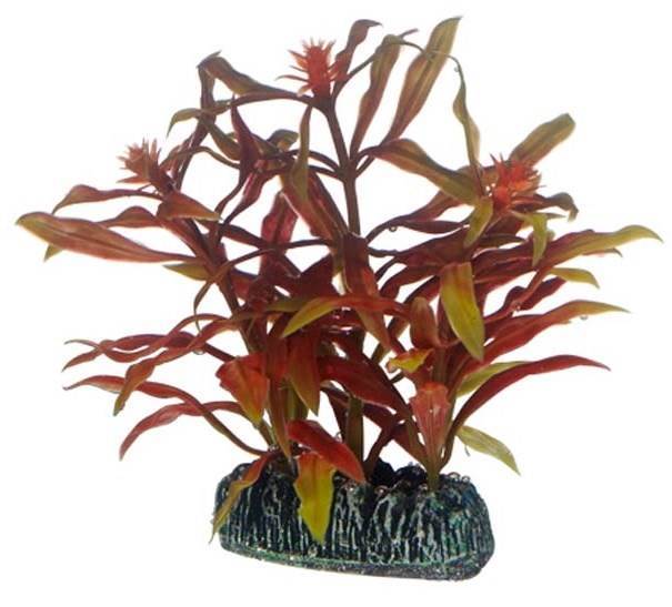 Naturlignende plasticplante med en kunstig sten for godt fæstne i gruset.