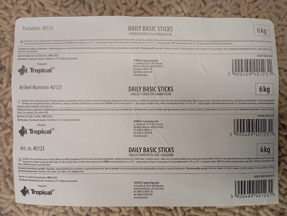 Foder i form af flydende pinde til daglig fodring af prydfisk i dammen. Fodret giver fisken en afbalanceret diæt, pillerne kan bruges året rundt og er let fordøjelig. Takket være en speciel struktur flyder pillerne på vandet, så dammen kan observeres og eventuelt tage de pinde tilbage, som ikke bliver spist af fiskene. Den høje kvalitet og det afbalancerede indhold af næringsstoffer og vitaminer gør, at fisken kan opretholde en god sundhed og tilstand selv i koldt vejr. Fodret indeholder ikke GMO.