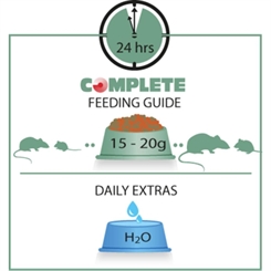 For en rotte og en mus anbefales en gennemsnitlig daglig ration på ca. 15 g foder.