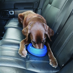 Kurgo rejseskål. Praktisk skål som har en hel særlig form, der forhindrer at vandet skvulper over. De høje sider og den tilspidsede kant forhindrer sprøjt, mens det unikke kiledesign sikrer, at skålen står lige, når den sættes på bilsædet.