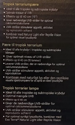Lavenergipære med UVA+B. 2.0 pæren er beregnet til regnskovs reptiler og har en farvetemperatur på 6700 kelvin.