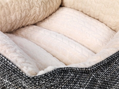 Robust yderstof i neutrale grå nuancer og blød plys i off-white.