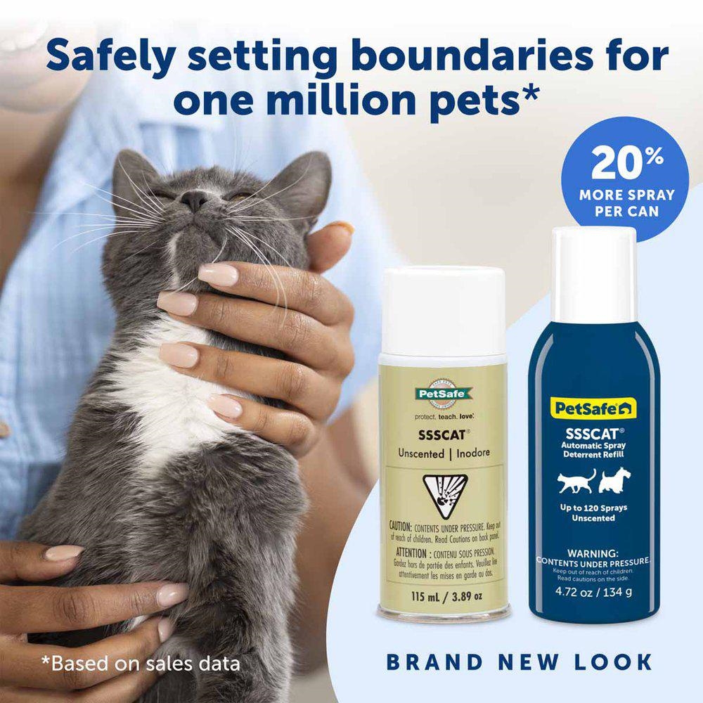 Det er nemt at udskifte genopfyldningen i din SSSCAT™ Automatic Spray Pet Repellent, og hver dåse giver op til 120 sprays for at afskrække dit kæledyr fra at gå ind i områder, hvor de ikke er tilladt. Placer din SSSCAT™ sprayholder hvor som helst, hvor du ikke ønsker, at dit kæledyr skal nå. Hvis dit kæledyr kommer inden for 0,9 meter fra dette område, vil SSSCAT™-enheden frigive en hurtig og lugtfri spray, der signalerer til dem, at dette er et begrænset område. Sprayen er uskadelig for både kæledyr og mennesker og efterlader ingen rester, hvilket gør den velegnet til indendørs brug overalt, hvor du har brug for den. Hvis du ejer den originale SSSCAT-model, kan du være sikker på, at disse genopfyldningsdåser er kompatible med din første generation af SSSCAT™ spraymekanisme. Dit kæledyr fortjener det bedste. Stol på PetSafe® for at holde dit kæledyr sundt, sikkert og glad.