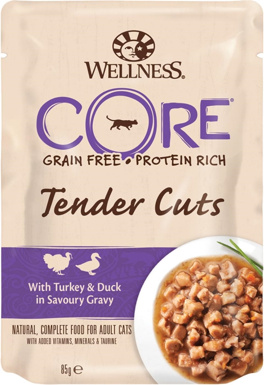 Vores Wellness CORE Tender Cuts med kalkun og and i velsmagende sovs er kornfri naturlige langsomt kogte møre udskæringer af fjerkræ kombineret med sunde grøntsager og frugter serveret i salte saucer, der giver en uimodståelig smag.