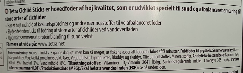 Tetra Cichlide Sticks er et basisfoder af høj kvalitet i pindeform, der er specielt udviklet til en sund og afbalanceret diæt til cichlider. Næringsindholdet imødekommer cichlidernes øgede behov for animalske proteiner og sikrer en naturlig afbalanceret kost. Stængerne flyder på vandoverfladen og svarer takket være deres ormelignende størrelse og form til fiskens naturlige spisevaner. Den unikke opskrift med naturlige ingredienser af høj kvalitet, uden farvestoffer eller tilsatte konserveringsmidler, samt den optimalt afbalancerede proteinblanding fremmer optimal vækst og øget modstandskraft. Med Tetra Cichlid Sticks vil dine cichlider trives, mens vandet i dit akvarium forbliver rent og klart.