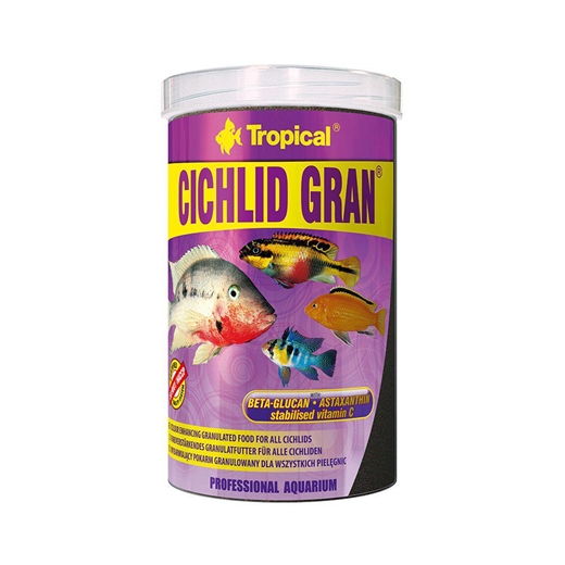 CICHLID GRAN er et komplet, farveforstærkende, fleringredienser, grovkornet foder til små og unge cichlider og andre akvariefisk. På grund af sin særlige tekniske fremstillingsproces er de blødgørende korn hurtige, og som et resultat accepterer fisken foderet meget hurtigere. Foret sikrer korrekt vækst og intensiv farvning.