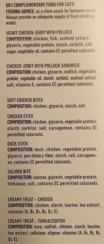 Creamy treat - Tuna & Codfish: Sammensætning: tun, torskefisk, kylling, stivelse, taurin, teekstrakt, cellulose, oligofructose, vitaminer (A, B2, B3, B5, D3, E).