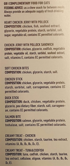 Hjerte kyllinge jerky med pollock: Sammensætning: kylling, fisk, seafood ekstrakt, glycin, vegetabilsk protein, stivelse, sorbitol, salt, vegetabilsk olie, indeholder EC tilladte farvestoffer.
