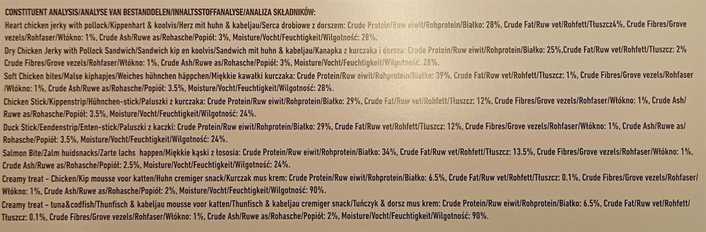 Creamy treat - Chicken: Crude Protein/Råprotein: 6.5%, Crude Fat/Råfedt: 0.1%, Crude Fibres/Grove veze: 1%, Crude Ash/Råaske: 2%, Moisture/Vægt: 90%.